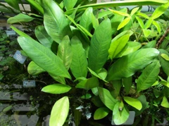 Anubias afzelii, often mislabeled as "Anubias congensis", is actually a synonym of Anubias heterophylla. True A. afzelii has reddish-brown leaf stalks and narrow leaves that can grow up to 40 cm in length with a lanceolate to oval shape. The plant's land form can reach heights of one meter, but cultivated plants tend to be smaller. It is native to West Africa, where it grows on sunny to shaded riverbanks and forms dense groups. A. afzelii can thrive as a submerged aquarium plant, although it grows slowly. Its robustness makes it suitable for cichlid tanks.
