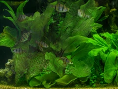 Aponogeton madagascariensis originates from flowing waters on Madagascar. Its unique lacy leaf structure has made it challenging to keep in aquariums since the 1950s. There are three varieties: var. henkelianus, var. major, and var. madagascariensis. Var. henkelianus has irregularly structured leaves, while var. major has evenly structured leaves. Var. madagascariensis grows larger, with smaller leaves up to 1 meter in length, including the leaf stalk. Its flowers are pink to purple. The plant cannot be propagated by self-pollination. The inflorescence of Aponogeton madagascariensis has a diameter of up to 1.5 cm. Fully grown plants require at least 500 liters of water volume. All varieties prefer substrates poor in nutrients and may develop dark brown, spreading dead zones if the substrate is too rich. The plant requires roots from other plants to get a firm hold in the aquarium, but these "helper plants" should not grow larger than Aponogeton madagascariensis or shade its leaves. It needs medium light intensity with direct light on the plant, CO2 fertilization, and sufficient micro- and macronutrients. The plant is susceptible to iron deficiency. It may require a resting phase where all leaves die off, but the tuberous root must never dry out. The plant may or may not sprout new leaves after this phase. If it doesn't receive enough CO2 and nutrients, it will still continue to grow new leaves by drawing on its reserves. Aponogeton madagascariensis grows best at temperatures below 24°C. At higher temperatures, growth slows down, and the plant produces smaller leaves. It releases seeds in a watertight pod that floats on the water surface for 1-2 days before splitting and releasing the seedling into the water. Under good growth conditions, young plants can reach 10 cm in length with a bulb diameter of around 1 cm after 3-4 months. They can be replanted safely when they reach this size. Var. henkelianus and var. major can grow compactly under sufficient light, making them suitable for the middleground of large aquaria. Var. madagascariensis is better suited for the background and requires a tank that does not allow its leaves to reach the water surface.
