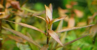 Ludwigia brevipes originates from southeastern USA, specifically in boggy areas along the Atlantic coast of Virginia, North Carolina, and South Carolina. It has narrow leaves and can be mistaken for Ludwigia arcuata when not in flower. In its emersed form, it can be distinguished by smaller petals and hairless stems compared to L. arcuata. For optimal growth, provide sufficient light (0.5 watts per liter or above) and consider adding micro- and macronutrients, especially with CO2 injection. Low nitrate levels with high phosphate readings may cause reddish-orange coloration on shoot tips. Emersed cultivation is possible with sufficient light. Trimming the plant will promote new lateral shoots, giving it a bushy appearance. Propagate by cutting off lateral shoots or shoot tips and replanting in the substrate. This plant is most effective when planted in groups in the foreground or middle ground, accompanied by species like Micranthemum umbrosum and Bacopa australis that highlight its reddish leaves.