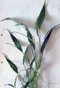 Schismatoglottis roseospatha is a rheophyte native to Malaysian forests in Borneo (Sarawak) where it grows on riverbanks, tolerating strong currents during high water. It has creeping rhizomes that attach to rocks with roots similar to those of Bucephalandra motleyana and Anubias barteri. This plant is relatively unknown in the aquarium hobby and can only be obtained from fellow hobbyists. The leaves are dark green, slightly shining, narrow oval to lanceolate, with finely undulate margins, tapering to a point, and reddish-brown stalks. The leaf surface has tiny dots that appear silvery under water (possibly stomata). This plant thrives in constant submersed cultivation despite being temporarily underwater in nature. It can be attached to rocks or driftwood using thread or planted into coarse substrates with the rhizome exposed. S. roseospatha is a slow-growing, low-reproducing plant that requires soft water, temperatures between 22-26°C, and good water movement.