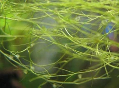 Utricularia gibba, also known as dwarf bladderwort, is a carnivorous plant that feeds on small animals. It's commonly found in warmer regions, growing in bogs and pond edges. Its unique appearance features tiny, almost stunted-looking leaflets on thin stems, which carry bladder traps for catching prey. The leaves don't grow in whorls like other aquatic bladderwort species. This plant can form floating cushions or settle between other plants or grow emersed on wet ground. It's not typically introduced intentionally and may become a nuisance due to its tangled growth habit. Utricularia gibba can establish itself in moss pads or lawnlike plantings, but it won't be controlled by aquarium maintenance conditions. The only way to keep this bladderwort in check is through patient removal with pincers, as it can regenerate from small stem pieces left behind. It's recommended not to introduce Utricularia gibba intentionally and to inspect any new additions for shoots or stem pieces of the plant.