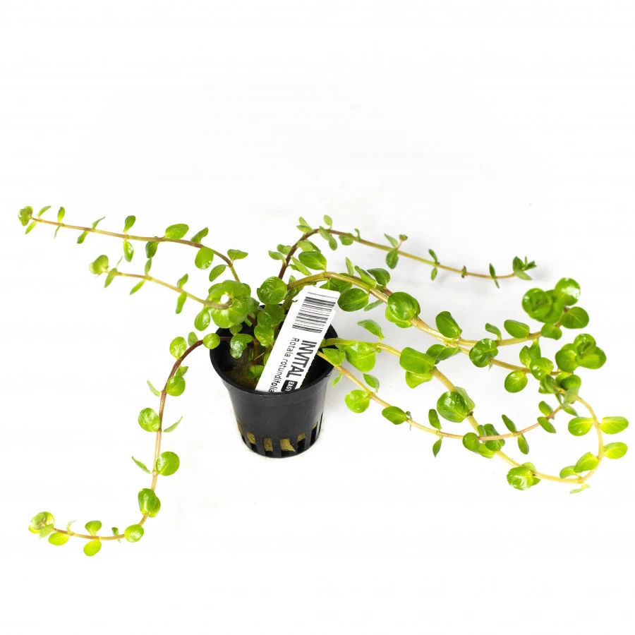 Rotala rotundifolia es una planta acuática originaria de Asia del Sur, donde crece en pantanos y riberas hasta los 2700 metros sobre el nivel del mar. La planta fue introducida en acuarios bajo el nombre incorrecto Rotala indica a mediados de la década de 1960, lo que causó confusión con la verdadera Rotala indica. La forma sumergida de R. rotundifolia tiene hojas elípticas o lineales alargadas en acuarios, mientras que la forma emergida tiene espigas florales candelabroides en la punta del tallo. El nombre científico "rotundifolia" se refiere a su forma de planta acuática esférica, pero la forma acuática tiene hojas con formas diferentes. Se ofrecen varias formas coloreadas de Rotala rotundifolia en el comercio y se pueden distinguir según su entorno. Esta planta es relativamente fácil de crecer y no exige mucho, prosperando bajo luz moderada y mostrando su potencial completo con una luz intensa (0,66 W/l). Requiere niveles bajos de nitratos (5 mg/l) y altos de fosfatos y hierro/micronutrientes para la mejor coloración. Rotala rotundifolia se puede propagar mediante tajadas de brotes laterales o superiores, que pueden replantarse en el sustrato. Esta planta es adecuada para colocaciones intermedias o de fondo en tanques y puede cultivarse al aire libre durante los meses cálidos o incluso sobrevivir inviernos suaves en un estanque.