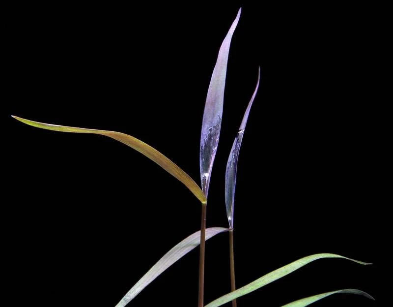 Les Poaceae sp. "Bambou violet" sont des plantes d'aquarium qui ont été mal identifiées comme Polygonum ou Persicaria à leur introduction. Cependant, elles appartiennent en réalité à la famille des graminées (Poaceae) et font partie des rares espèces de ce groupe cultivées dans les aquariums. La venation foliaire parallèle confirme son affiliation avec Poaceae. Cultivée en Asie et aux États-Unis, elle demeure inconnue en Europe. Le nom "Bambou violet" fait référence à sa ressemblance avec le bambou, qui appartient également à la famille des Poaceae. Cependant, contrairement à la plupart des espèces de bambou, ce graminée ne lignifie pas et ne grandit pas. Son espèce et son genre exacts restent inconnus en raison d'origines non vérifiées et d'un manque de fleurissement. Cette plante est facile à entretenir et peut prospérer dans des aquariums "low-tech" ou "no-tech" avec une luminosité suffisante, une injection de CO2 et des nutriments. Elle forme des teintes impressionnantes violes et argentées sous les conditions optimales et produit des bulles d'oxygène importantes sur sa surface. Son habitude de croissance droite et son aspect délicat en font un choix idéal pour l'aquascaping minimaliste inspiré des styles asiatiques. Elle peut être utilisée en groupes de nombres impairs et nécessite un tri occasionnel pour maintenir un look rigide. De plus, cette plante est bien adaptée aux paludaria et peut être cultivée immergée au-dessus du niveau de l'eau, ce qui la rend une excellente choix pour créer un environnement naturel autour des bois flottants ou comme élément de fond dans les aquariums ouverts. Un tri régulier est nécessaire lors de la culture de cette plante immergée, car ses tiges peuvent atteindre plus d'un mètre si elles ne sont pas tronquées.